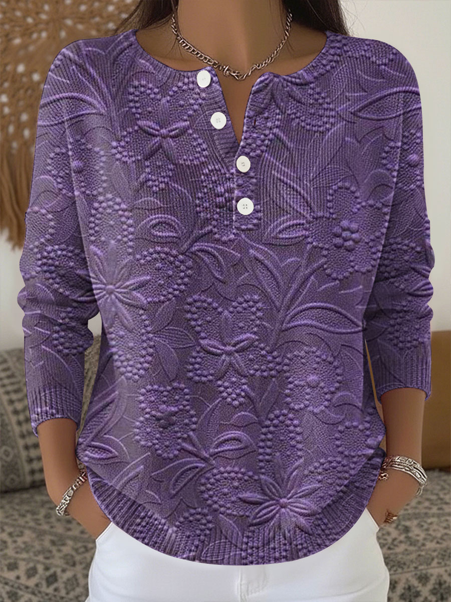 Women's Vintage Purple Floral Art Print Ribbed Round-Neck Sweatshirt