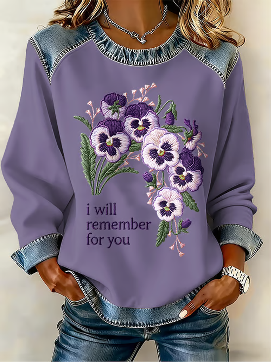 Women's Casual Alzheimer's Awareness Printed Ribbed Round-Neck Sweatshirt
