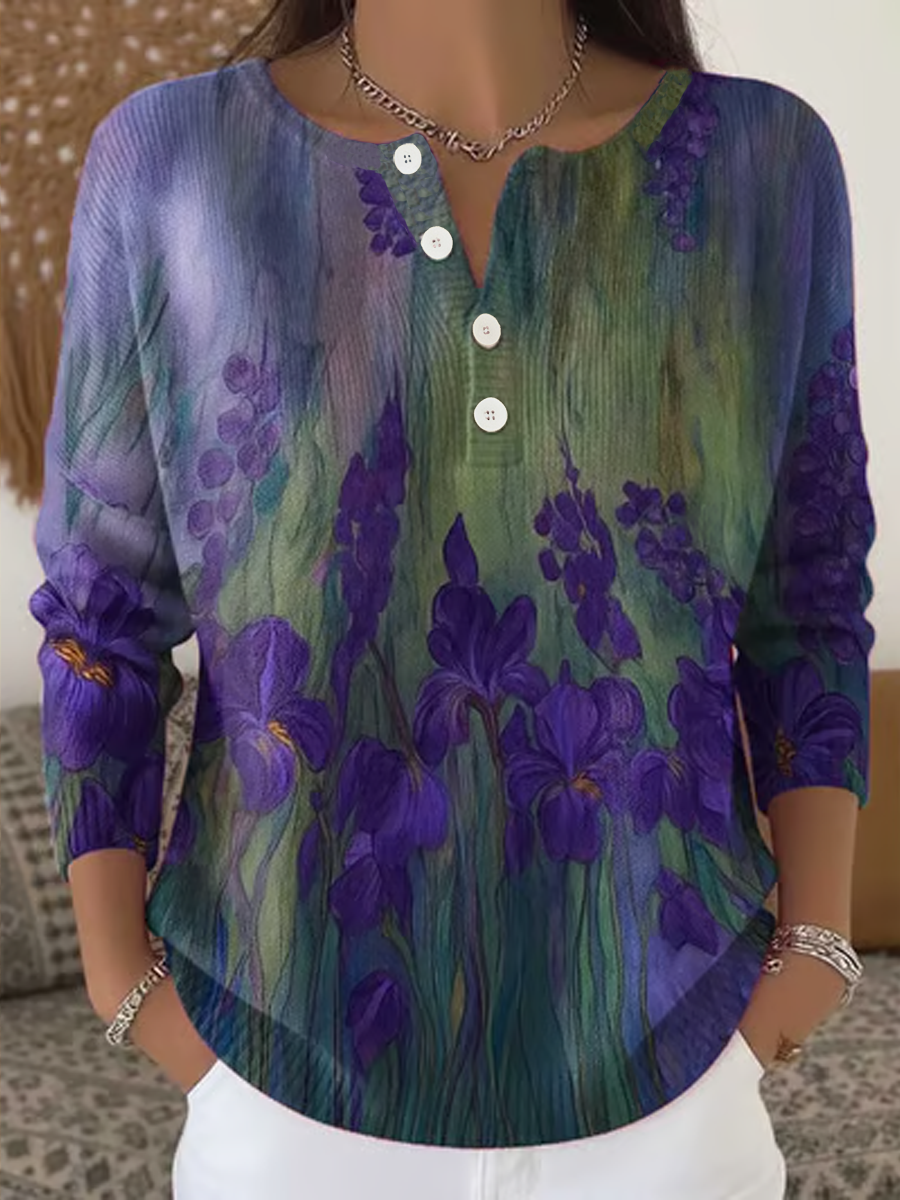 Women's Vintage Purple Floral Art Print Waffle T-shirt