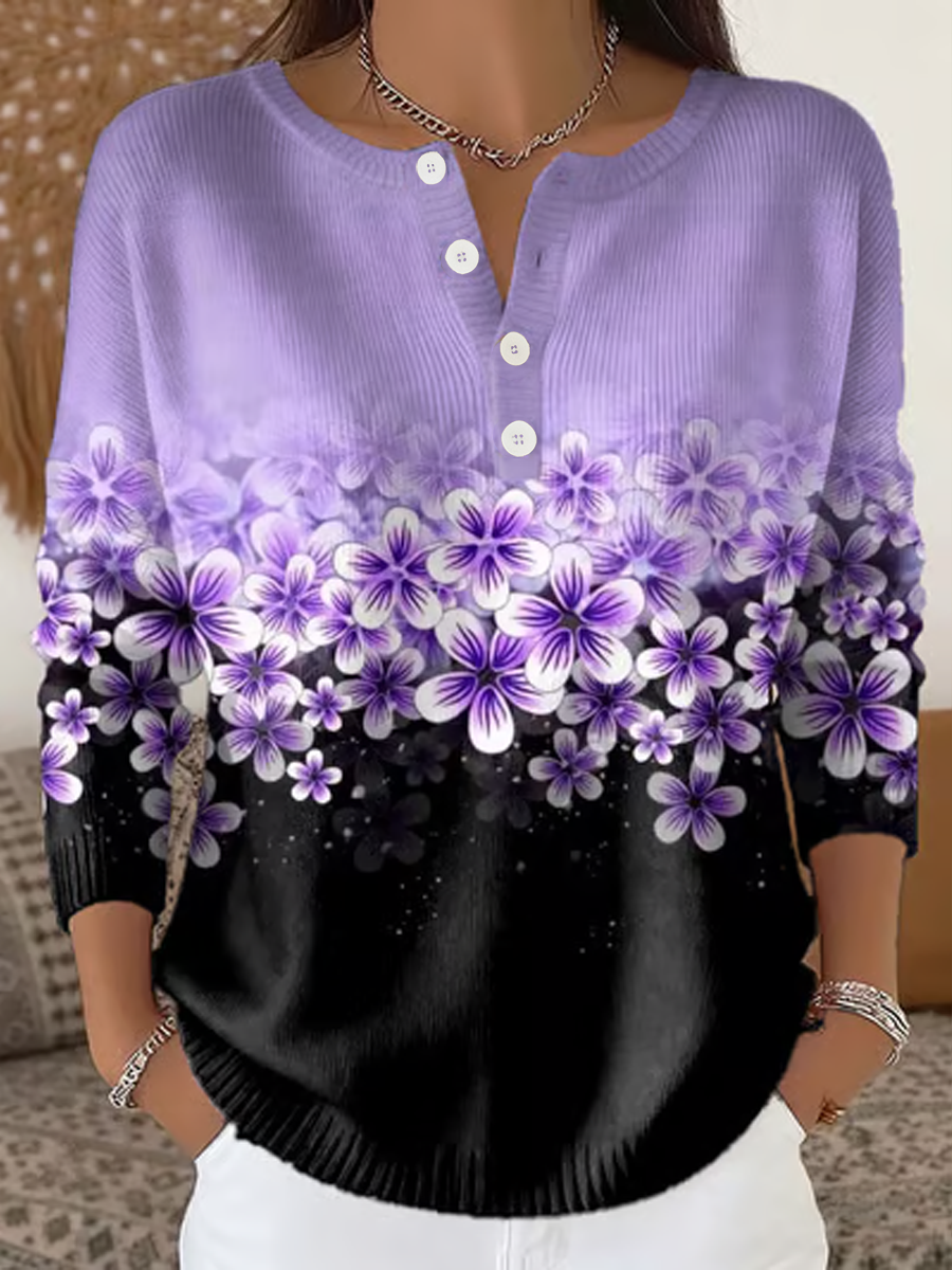Women's Purple Floral Printed Ribbed Round-Neck Sweatshirt