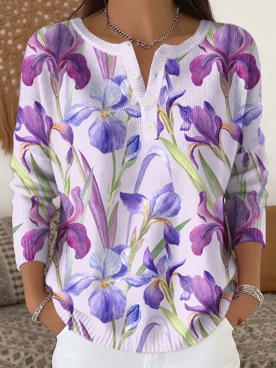 Women's Vintage Purple Floral Art Print Ribbed Round-Neck Sweatshirt