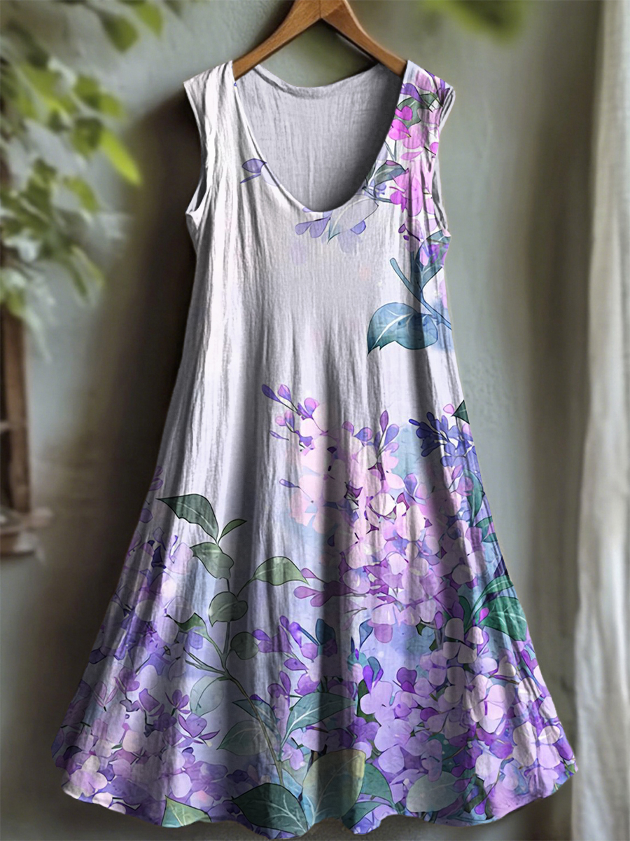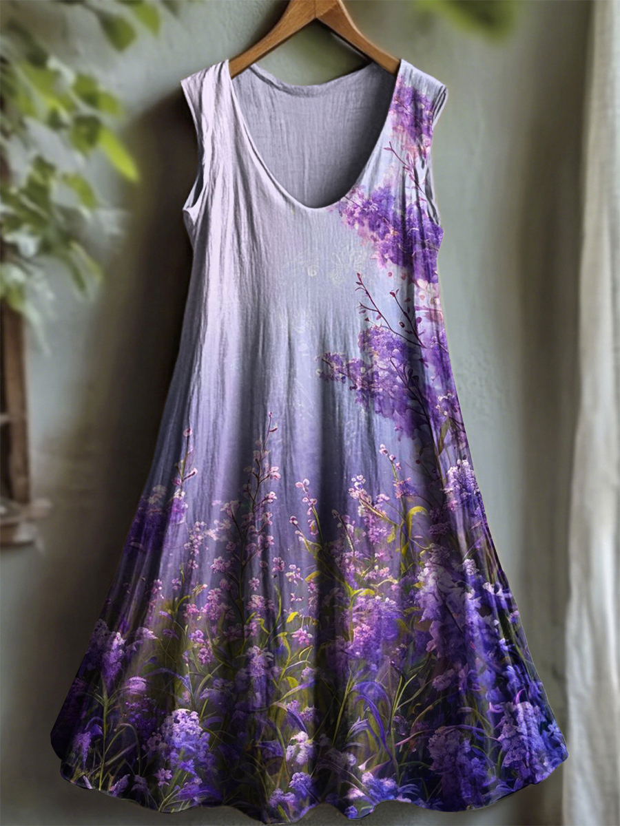 Women's Purple Flora Art Print V-neck Dress