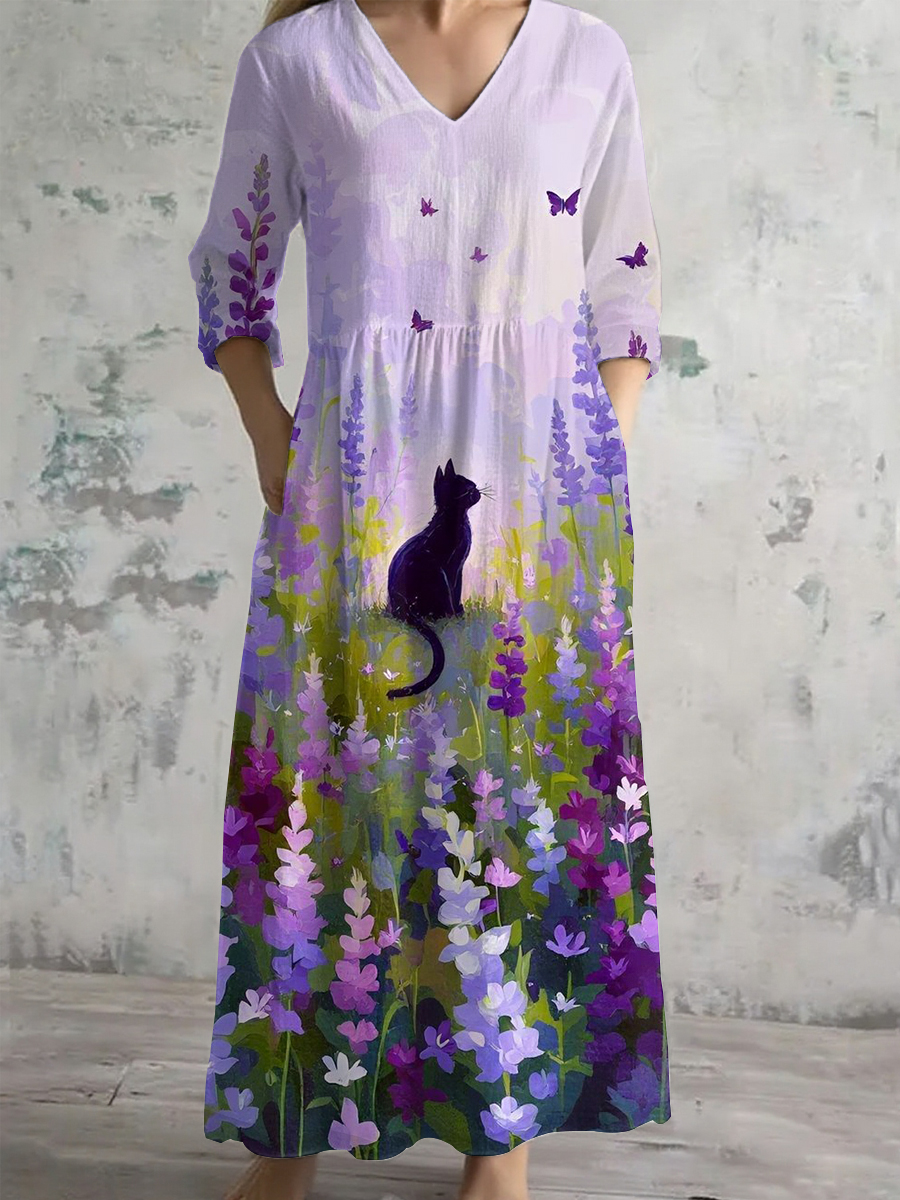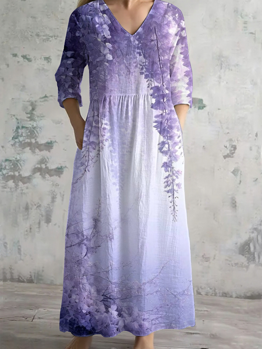 Women's Purple Flora Art Print V-neck dress with pockets