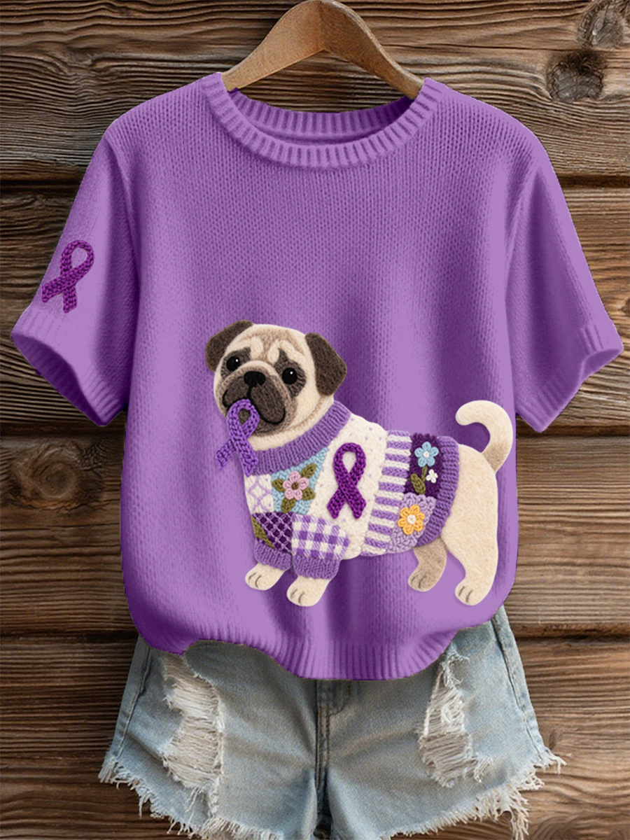 Women's Felt Art Pug Pattern Cozy Knit Top
