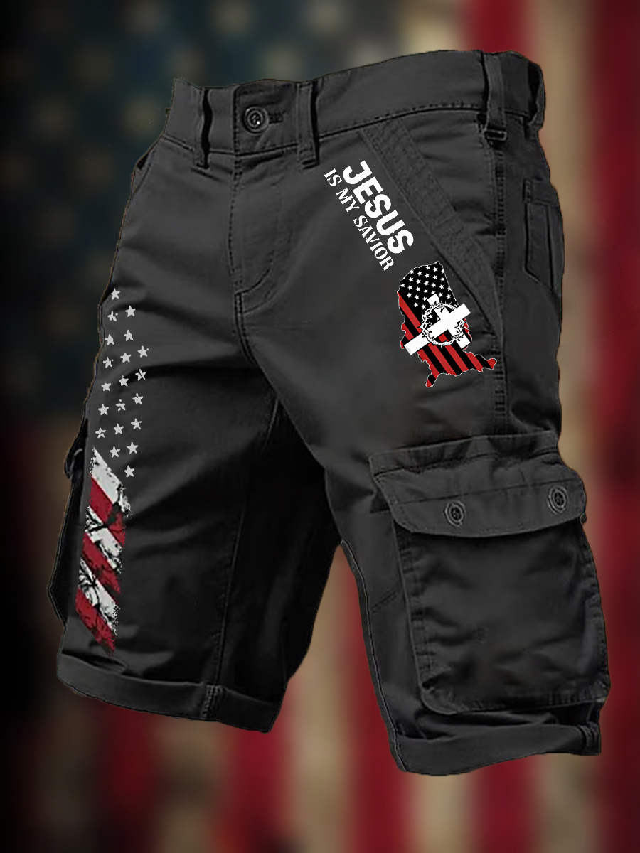 Men's Jesus Is My Savior American Flag Print Casual Cargo Shorts