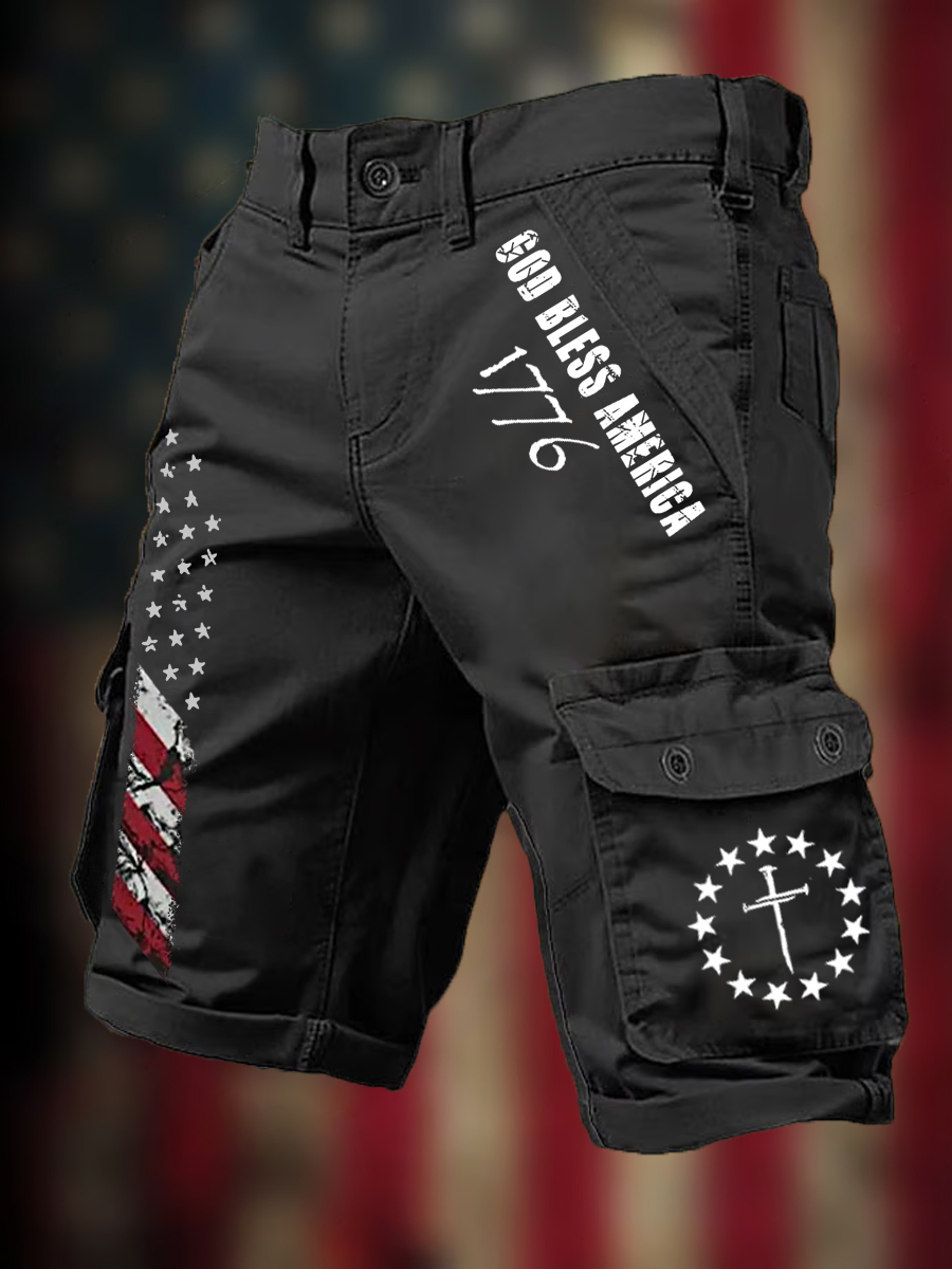 Men's God Bless America 1776 American Flag Print Casual Cargo Shorts