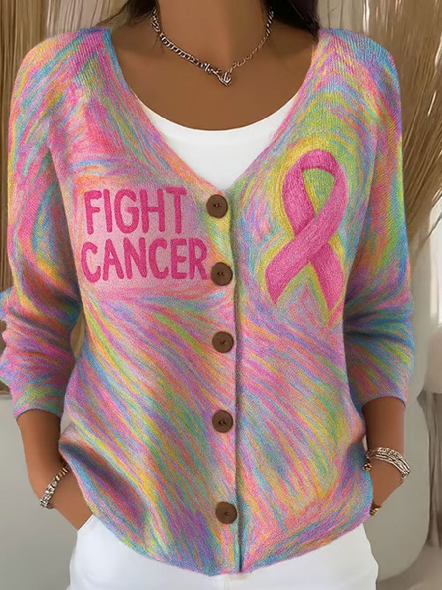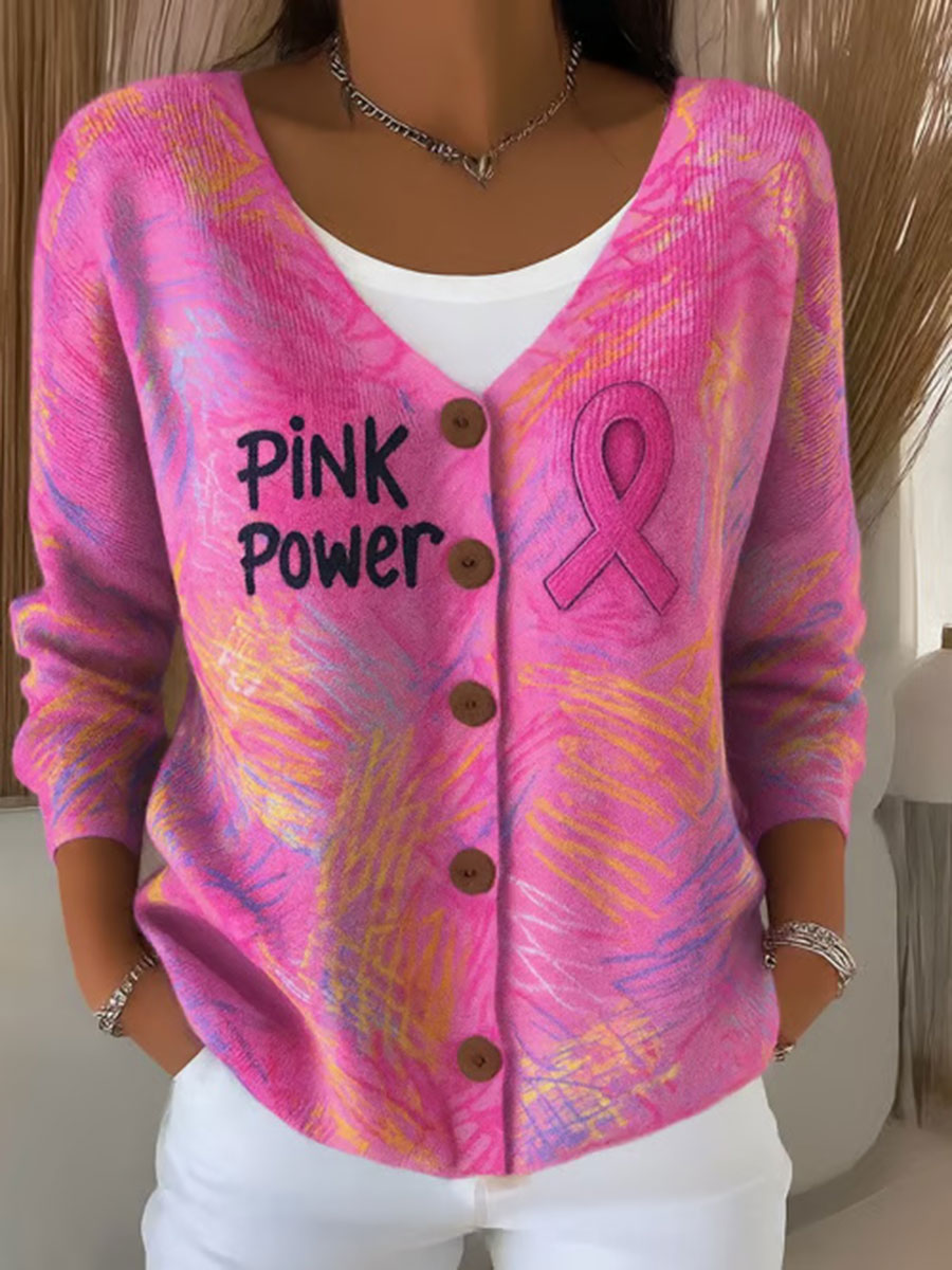 Women's Pink Ribbon Print Casual Cardigan