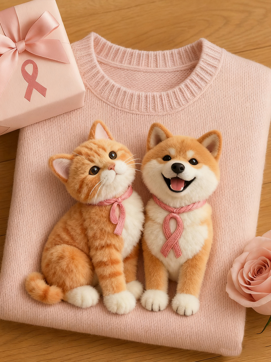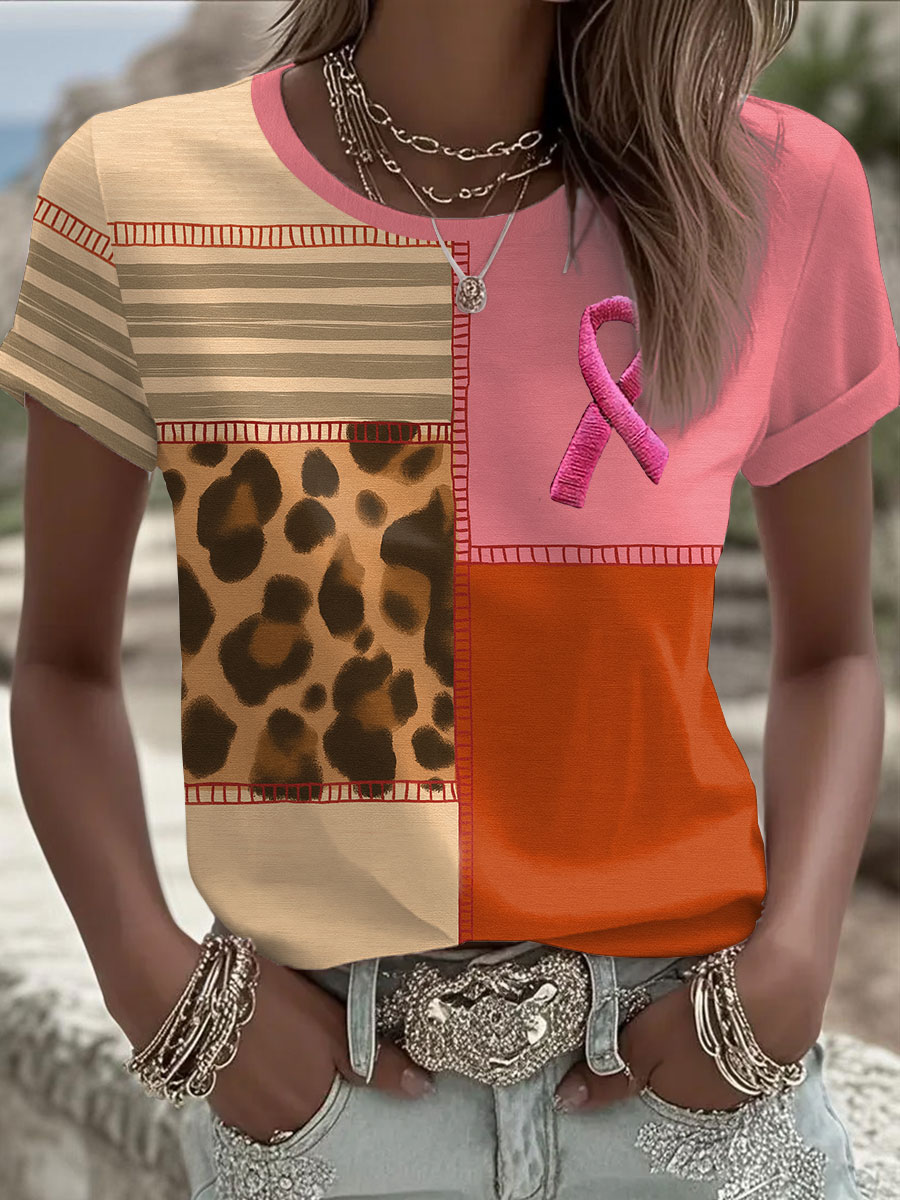 Women's Cat Pink Ribbon Print Casual T-shirt