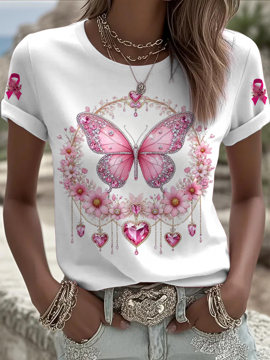 Women's Breast Cancer Butterfly Flower Printed Vintage Fashion Loose Short Sleeve T-Shirt