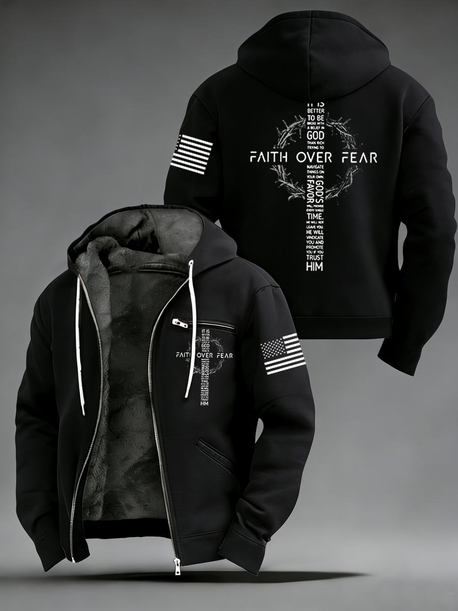 Men's Faith Over Fear Print Casual Plush Zipper Jacket