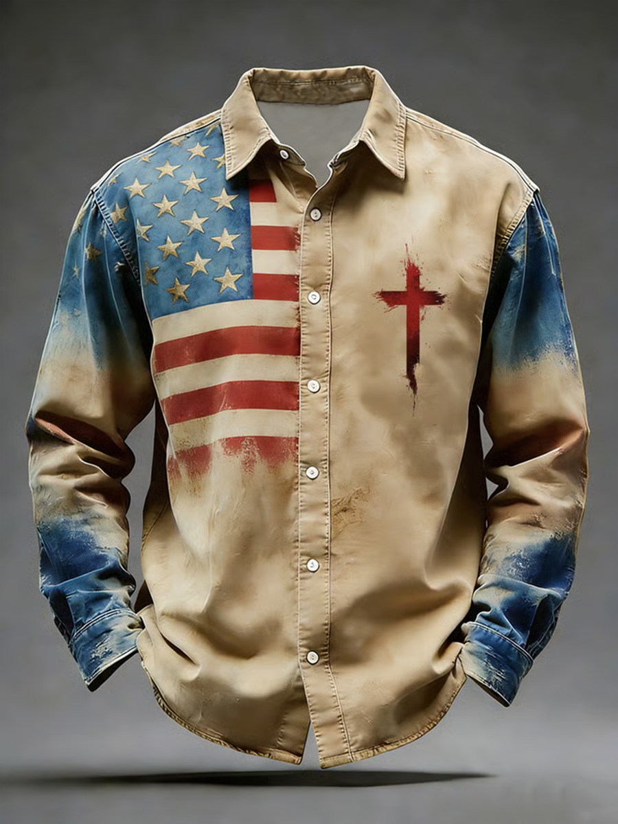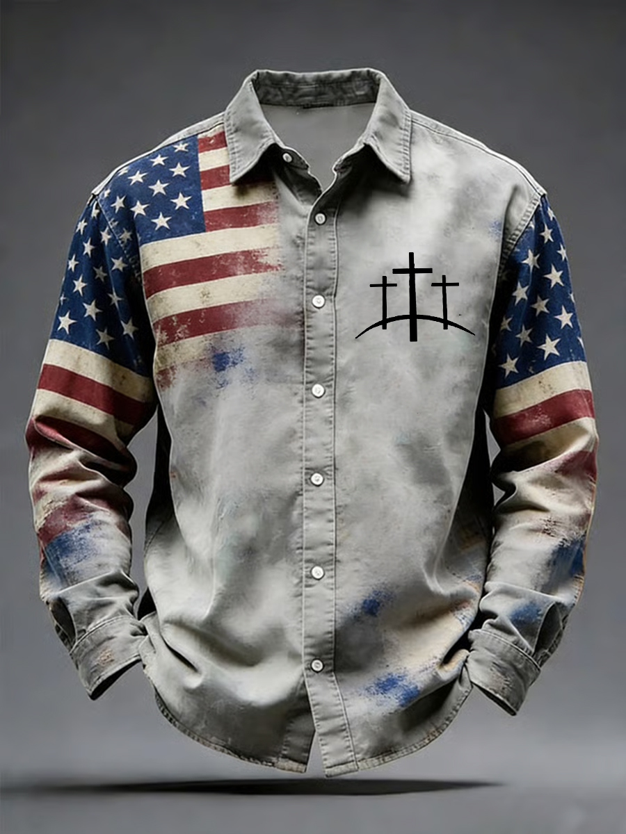 Men's Vintage Flag Christian Faith Cross Printed Shirt