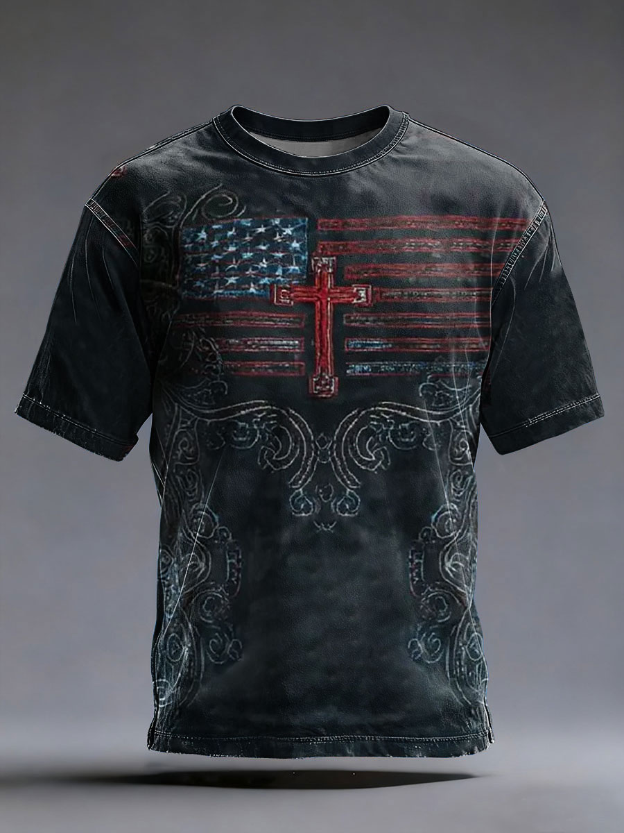 Men's Vintage America Flag Christian Cross Short Sleeve T-shirt
