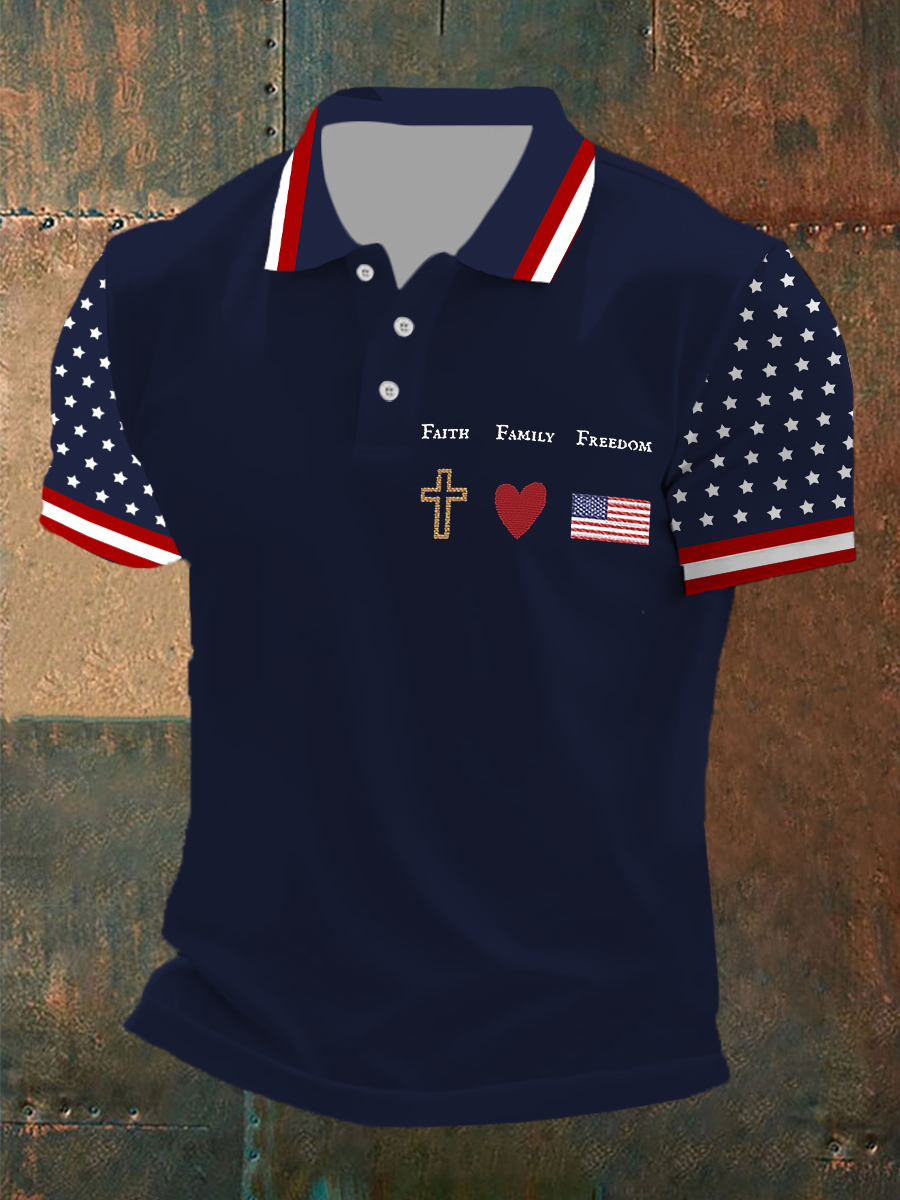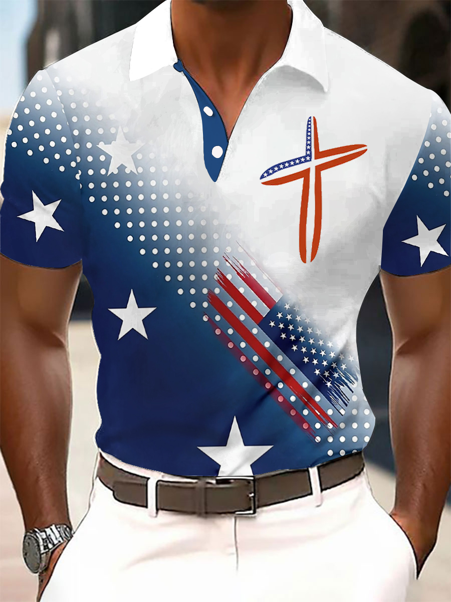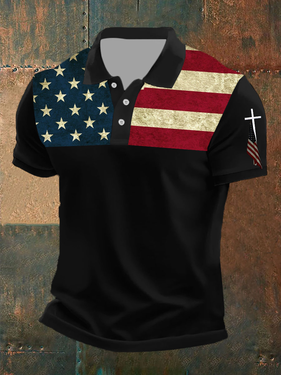 Men's Faith Cross American Flag Print Polo T-shirt