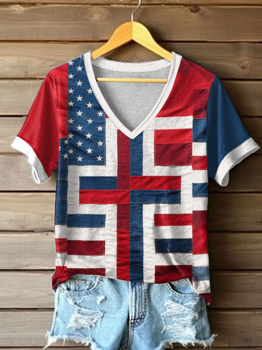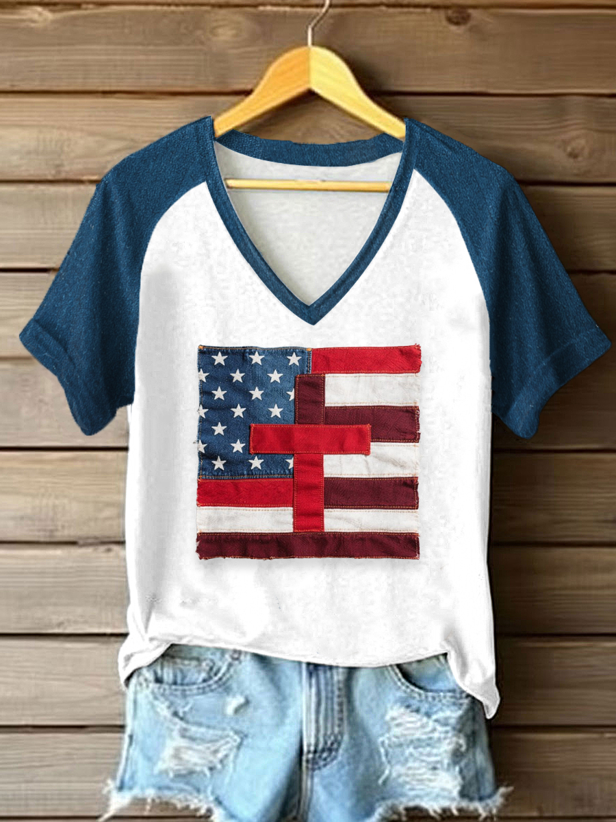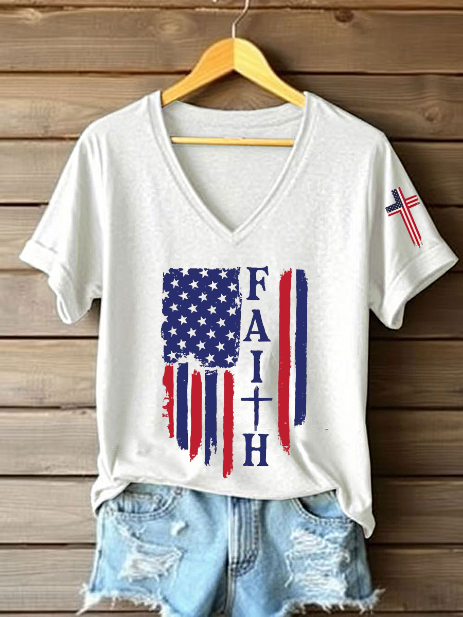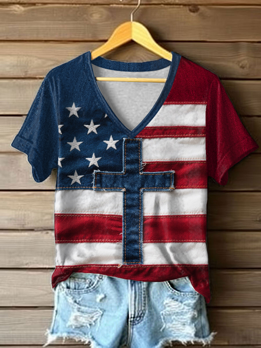 Women's Stand For The Flag, Kneel For The Cross American Flag Print Casual V-Neck Tee