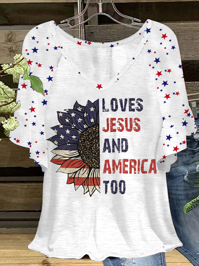 Women's She Loves Jesus And America Too Sunflower American Flag Print Casual Short Sleeve T-Shirt