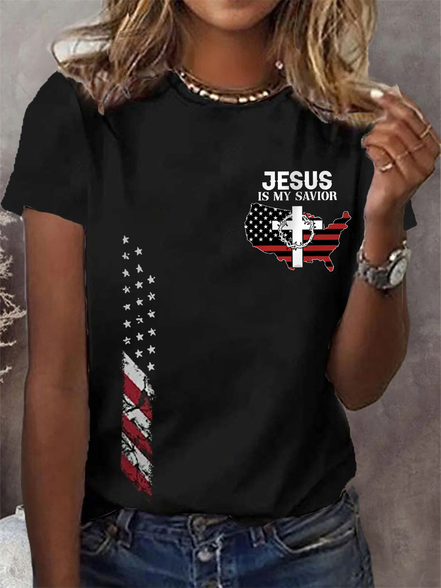 Women's Jesus Is My Savior American Flag Print Casual Tee