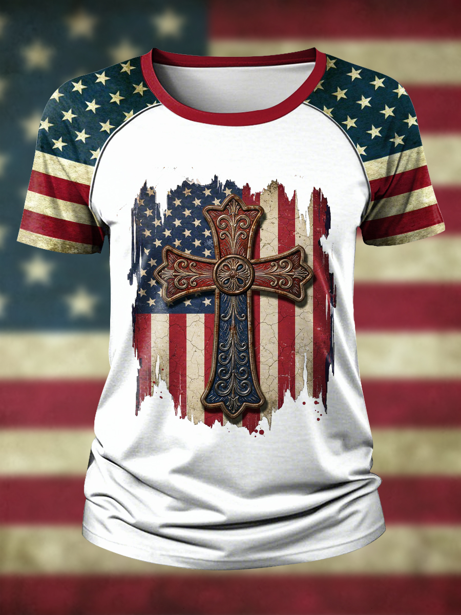 Women's American Flag Cross Print T-Shirt