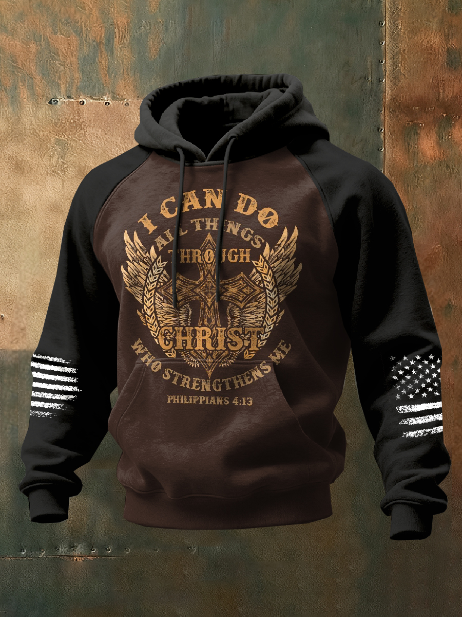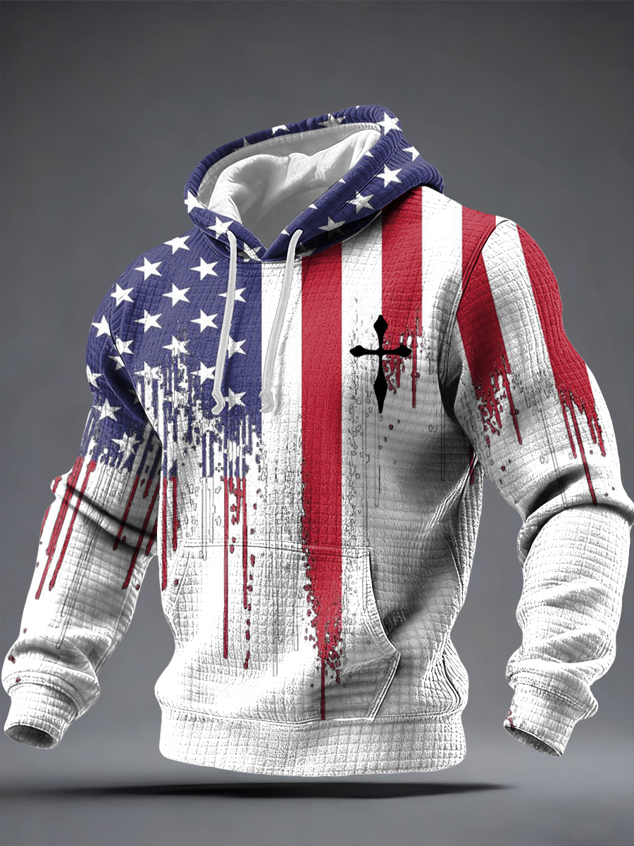 Men's Vintage Faith Flag Cross Print Checkered Cotton Hoodie