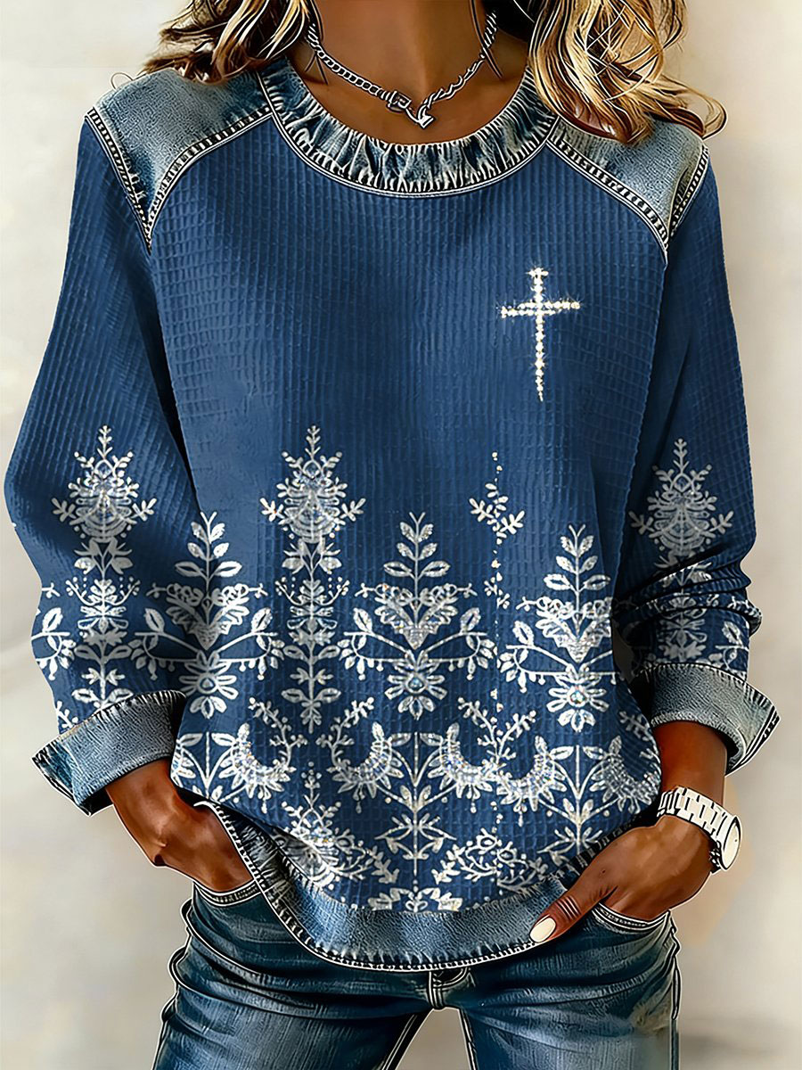 Women's Cross Print Casual Denim Patchwork Top