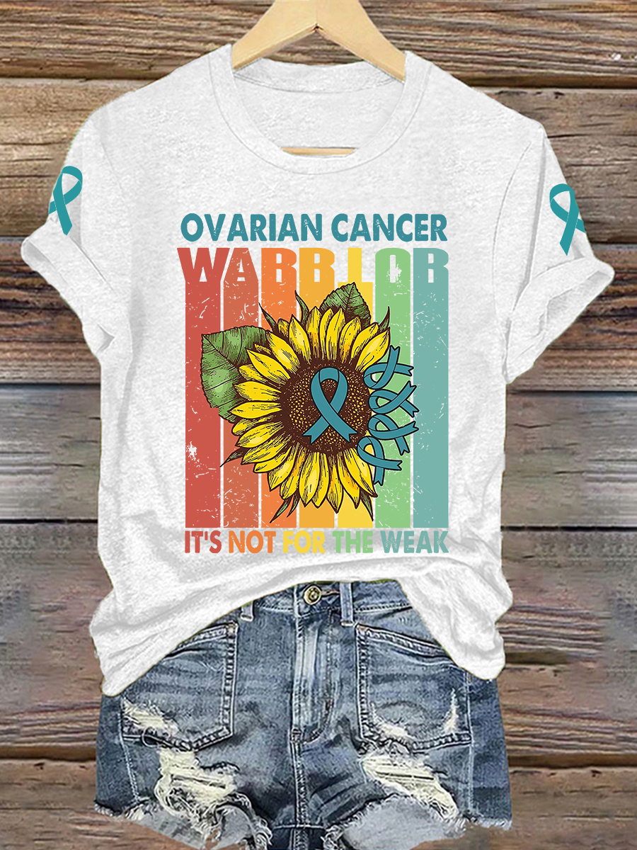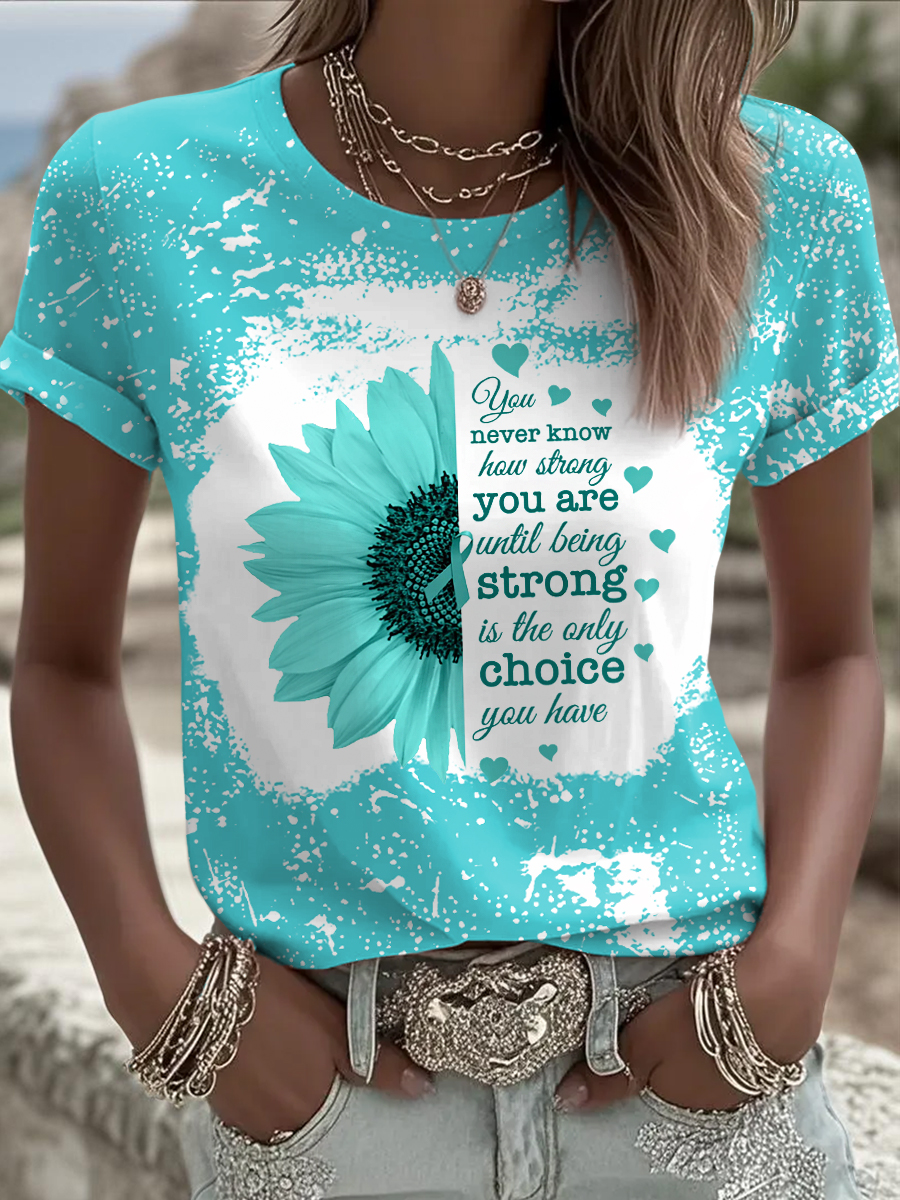 Women's Sunflower Teal Ribbon Print Ovarian Cancer Awareness Tee