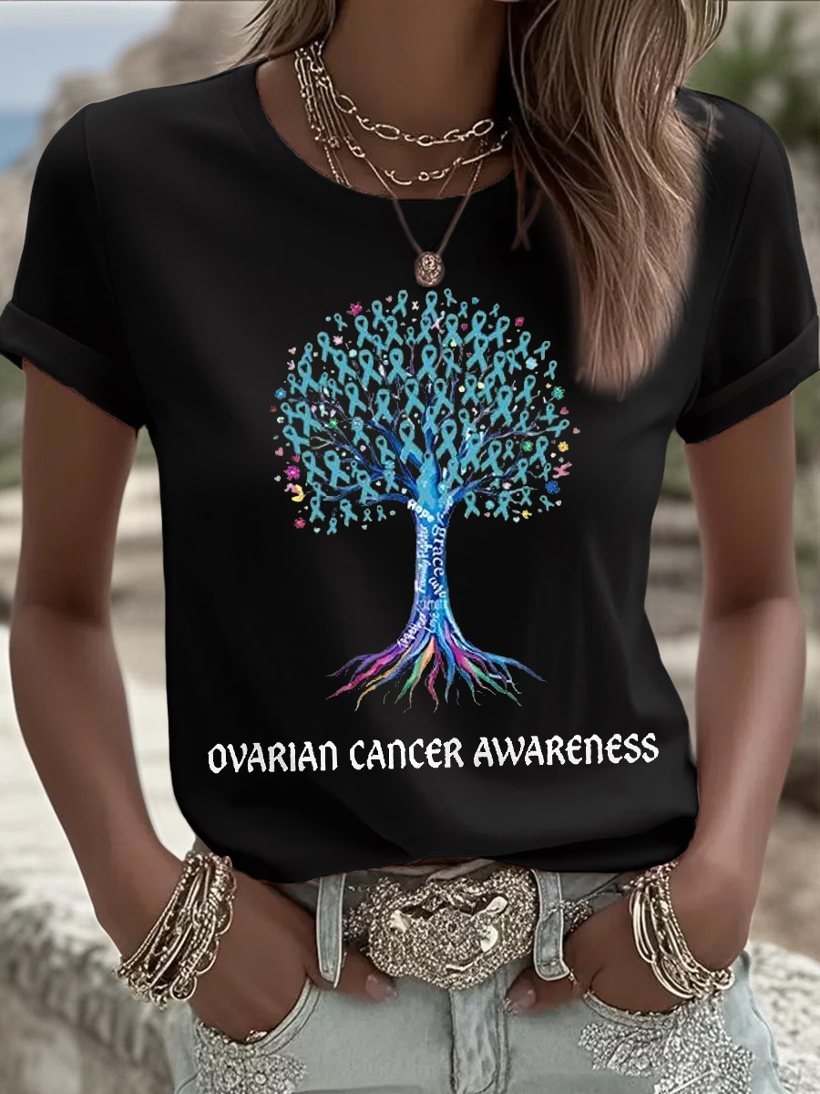 Women's Teal Ribbon Tree Print Ovarian Cancer Awareness Tee