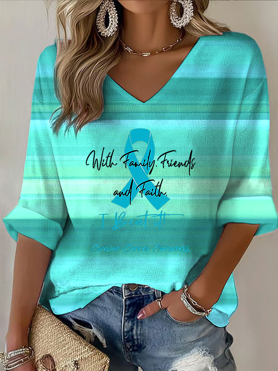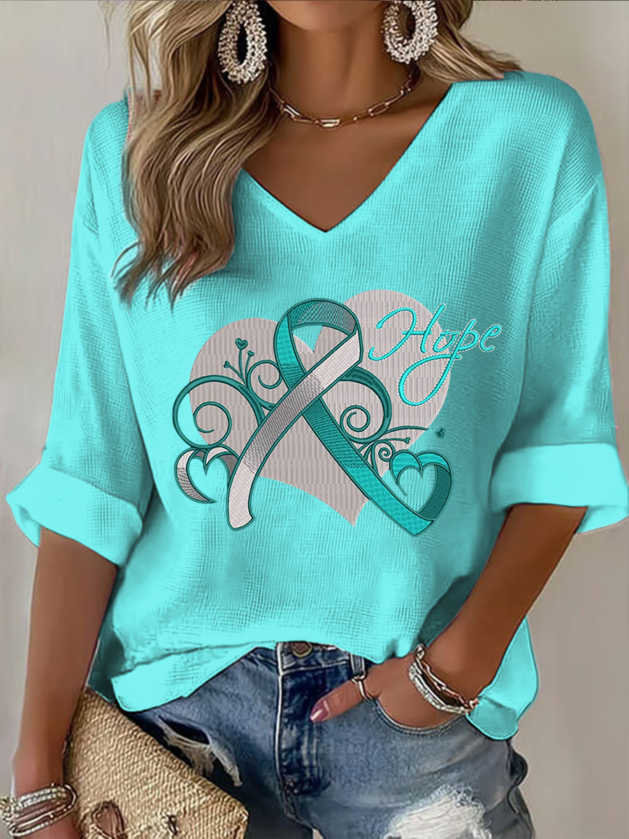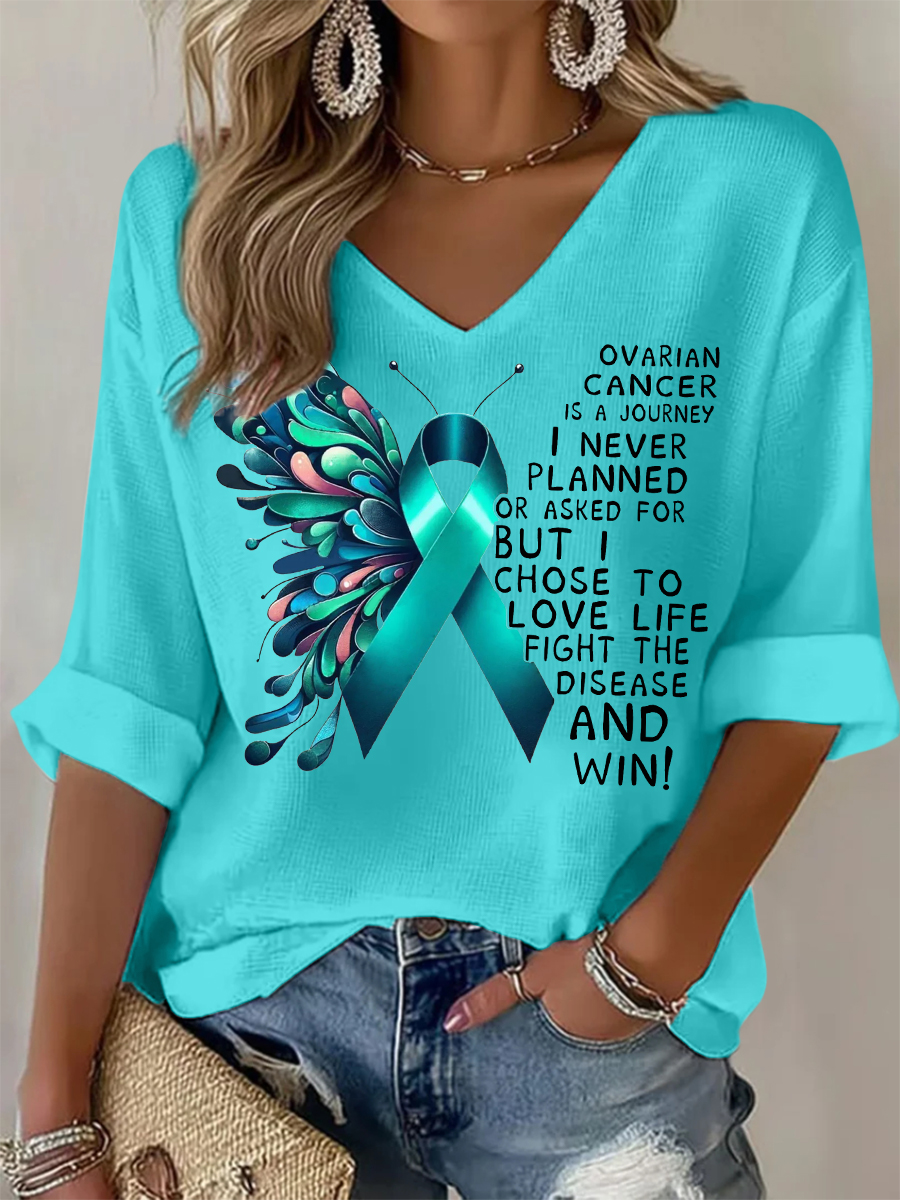 Women's Teal Ribbon Ovarian Cancer Awareness Support V-Neck Tee