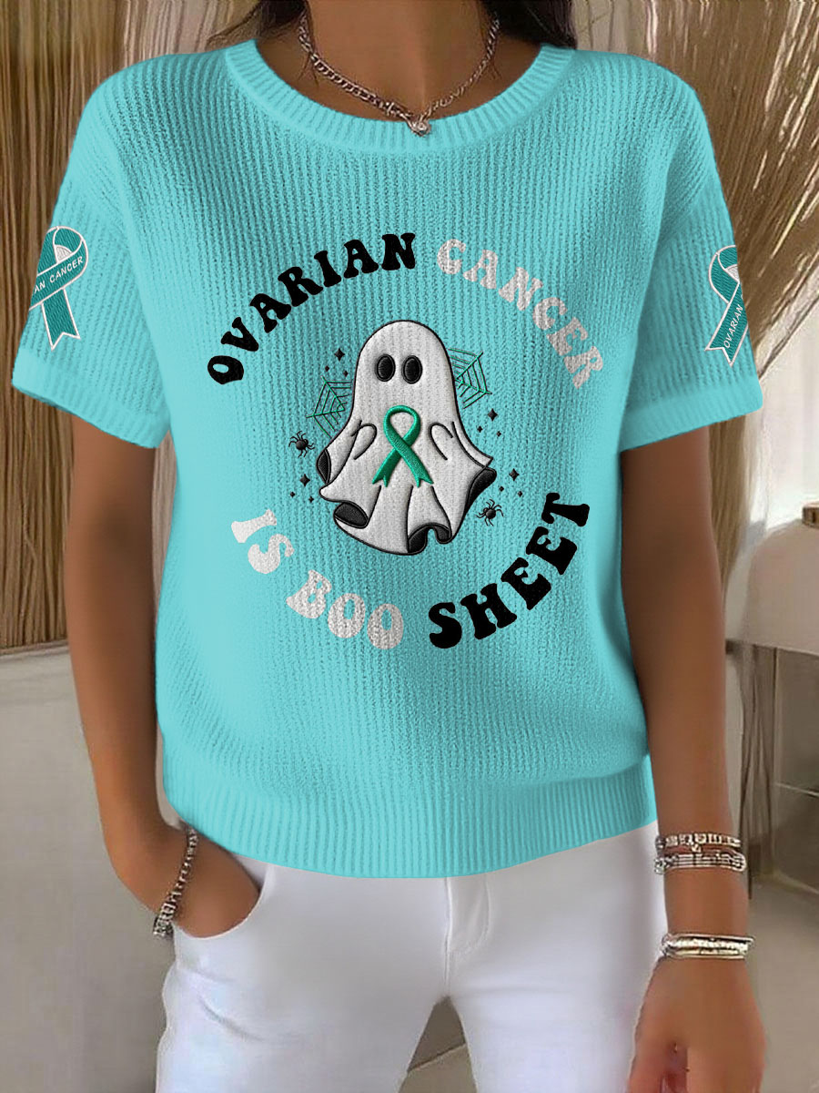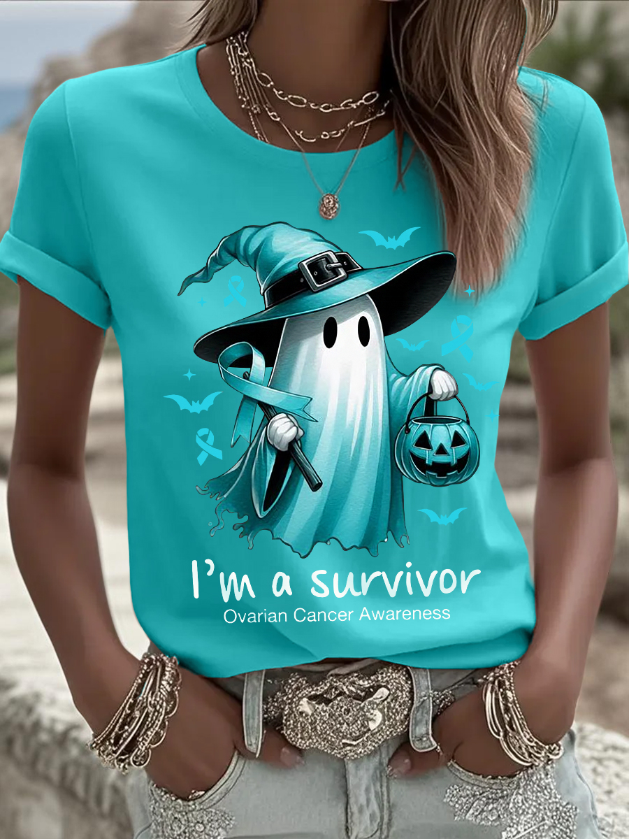 Women's Teal Ribbon Halloween Ghost Print Ovarian Cancer Awareness Tee