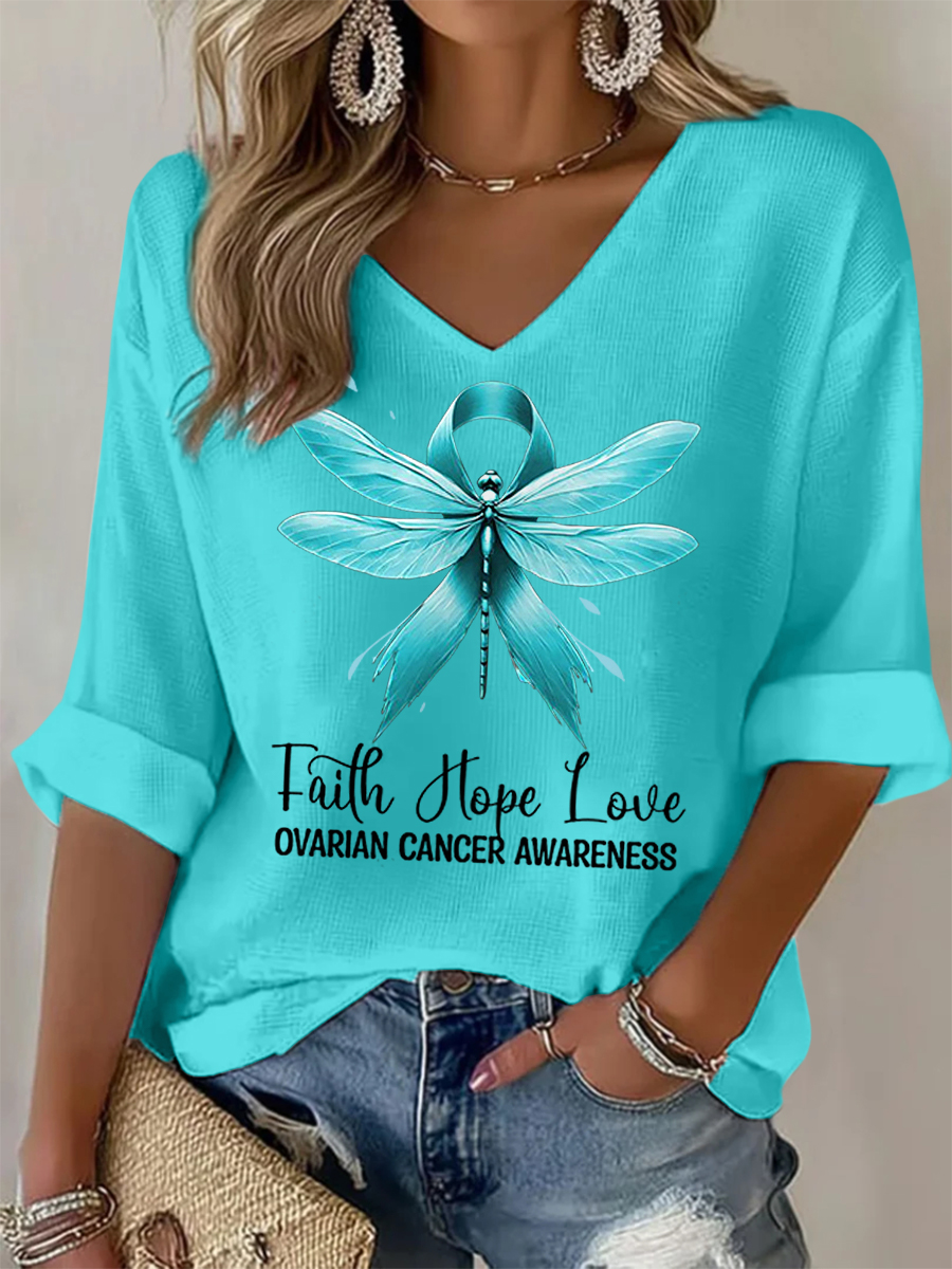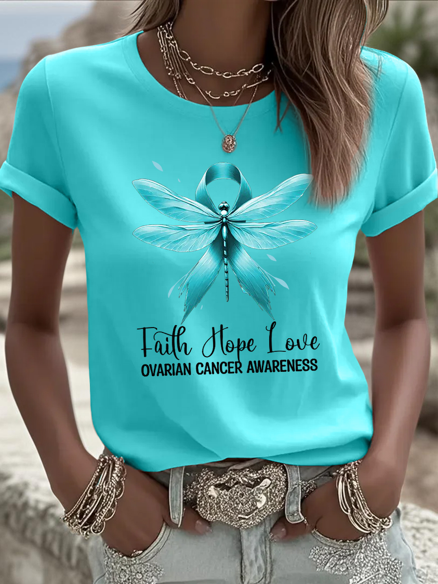 Women's Faith Hope Love Teal Ribbon Dragonfly Print Ovarian Cancer Awareness Tee