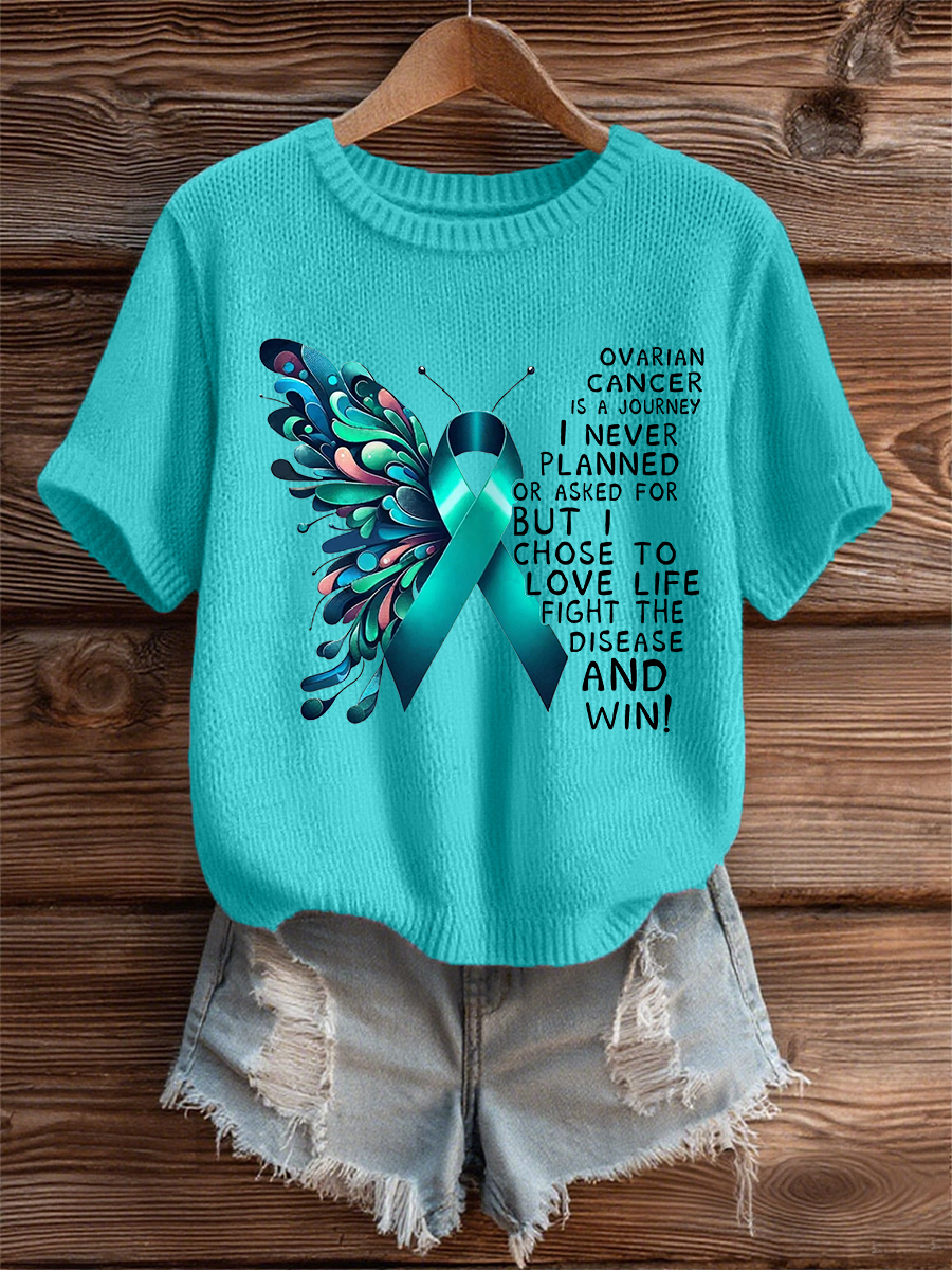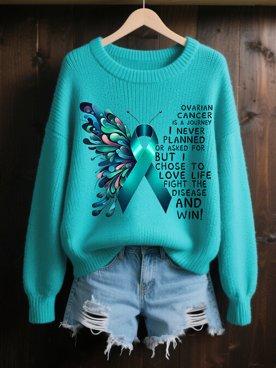 Women's Teal Ribbon Butterfly Print Ovarian Cancer Awareness Sweater