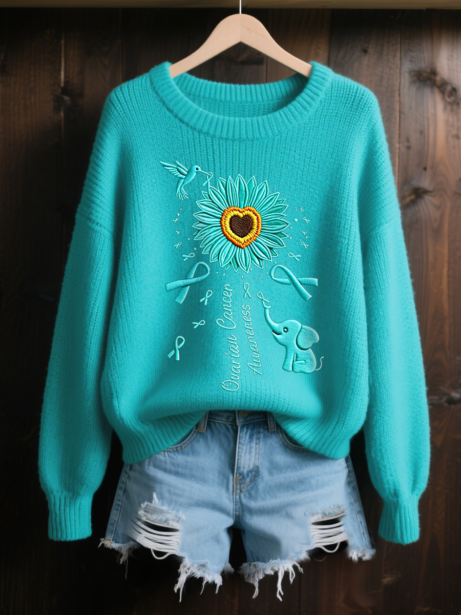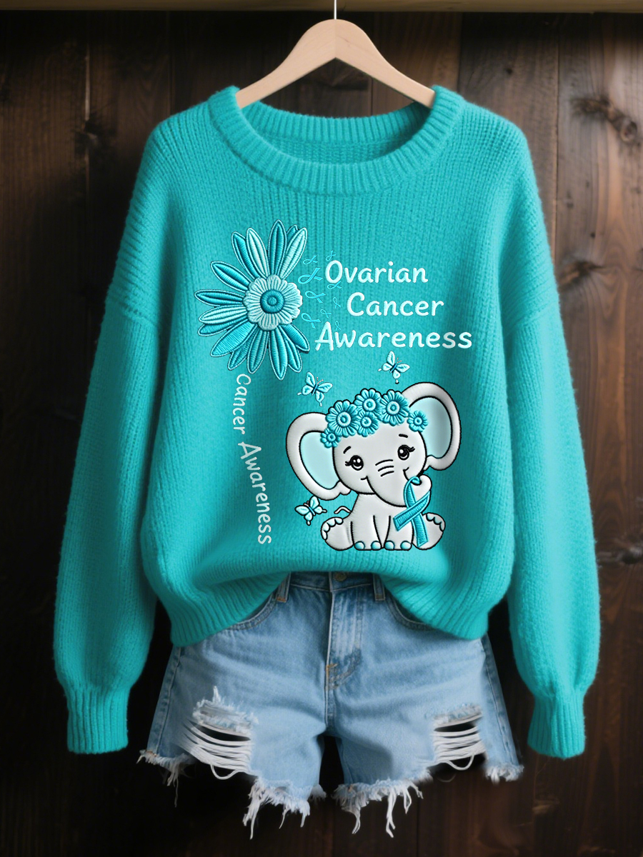 Women's Teal Ribbon Sunflower Elephant Print Ovarian Cancer Awareness Sweater
