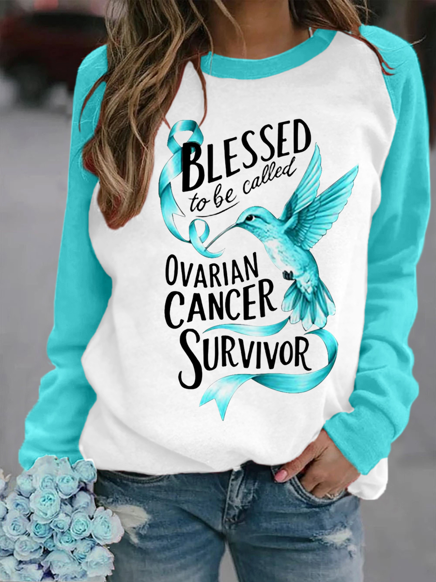 Women's Teal Ribbon Hummingbird Print Ovarian Cancer Awareness Sweatshirt
