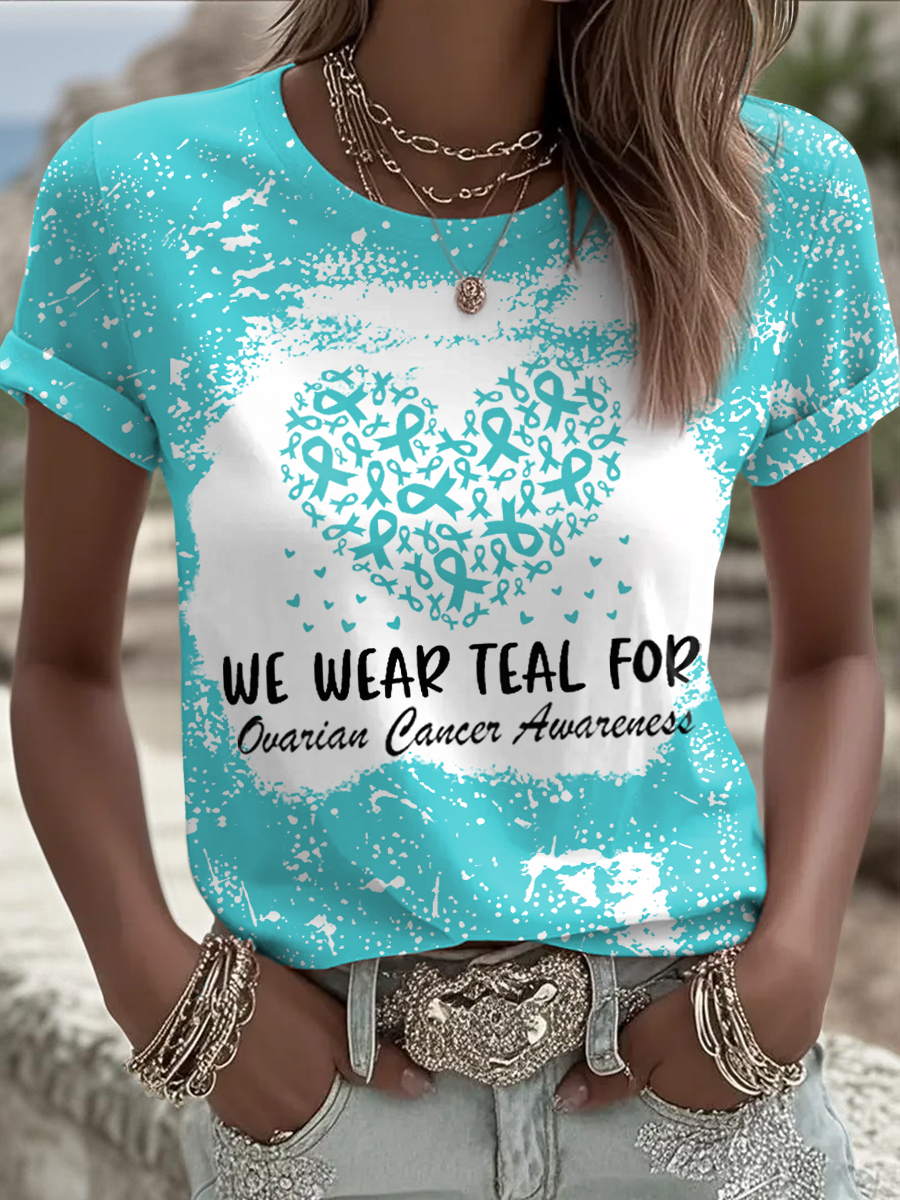 Women's We Wear Teal For Ovarian Cancer Awareness Teal Ribbon Love Heart Print Tee