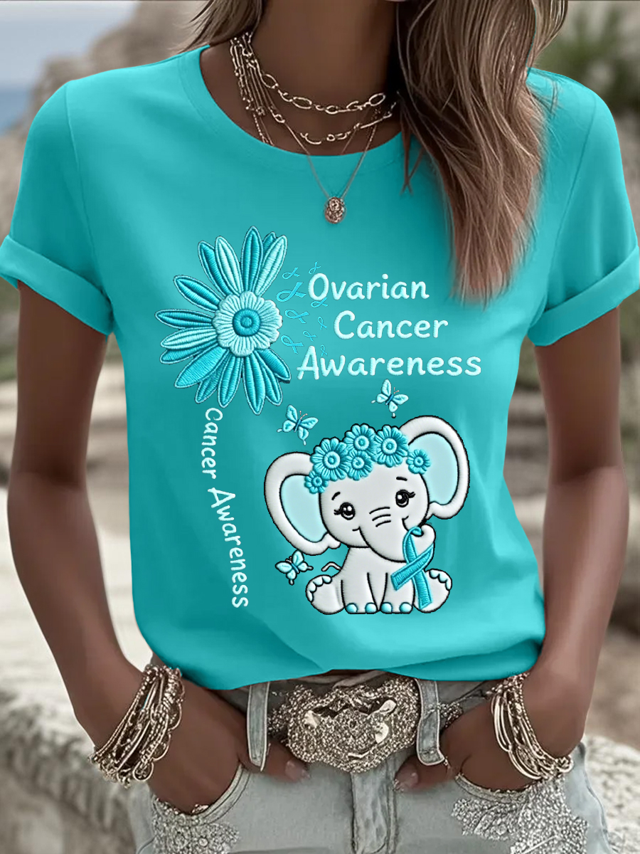 Women's Sunflower Teal Ribbon Elephant Print Ovarian Cancer Awareness Tee
