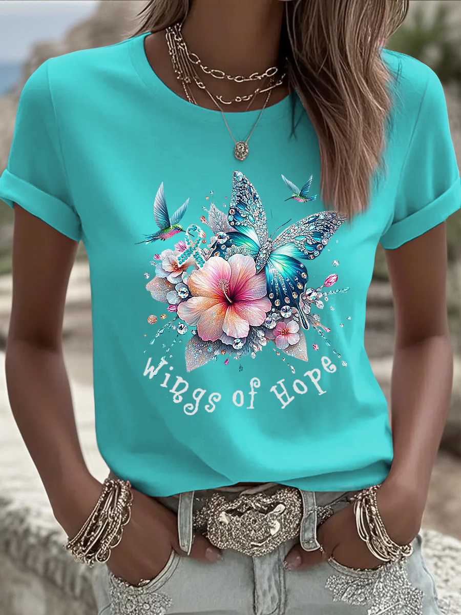 Women's Butterfly Teal Ribbon Print Ovarian Cancer Awareness Tee