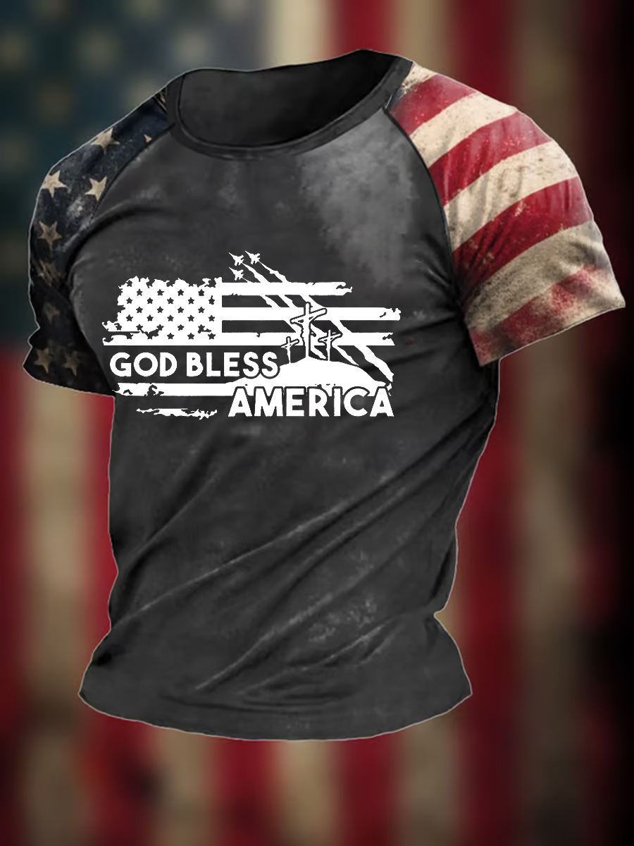 Men's God Bless America Christian Cross Flag Printed Short Sleeve T-shirt