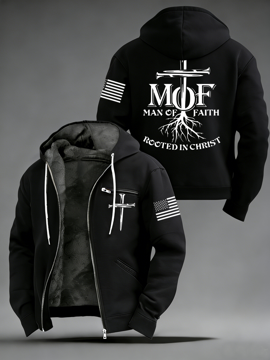 Men's Man Of Faith USA Flag Print Casual Zipper Hooded Plush Jacket