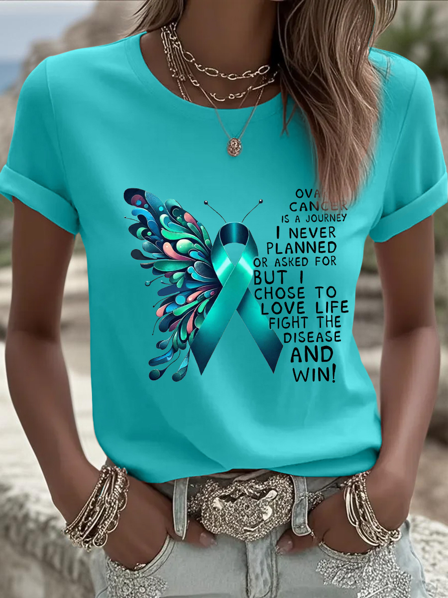 Women's Butterfly Teal Ribbon Print Ovarian Cancer Awareness Tee
