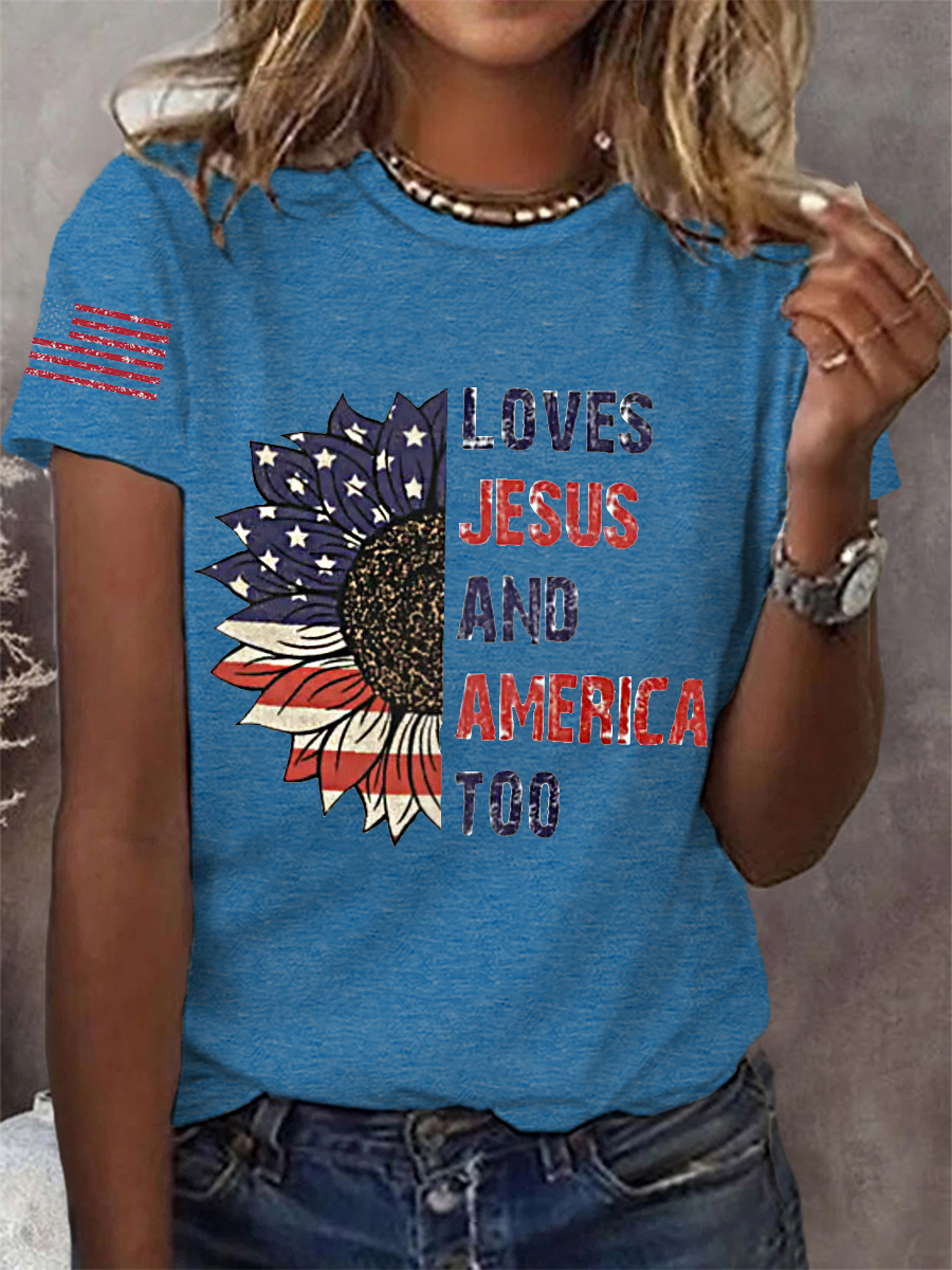 Women's She Loves Jesus And America Too American Flag Sunflower Casual Tee