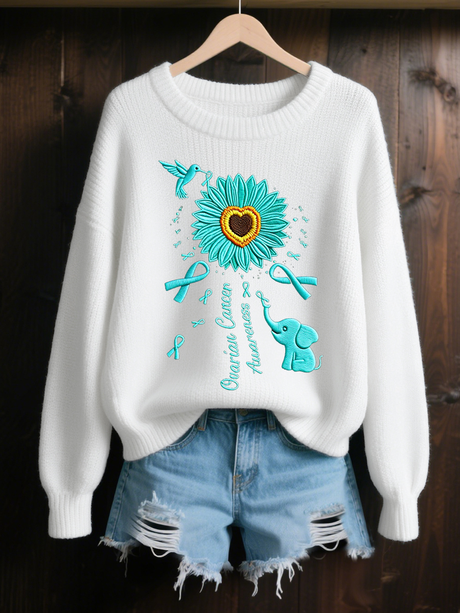 Women's Teal Ribbon Sunflower Elephant Print Ovarian Cancer Awareness Sweater