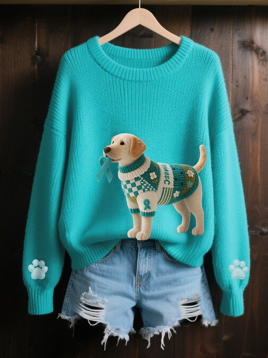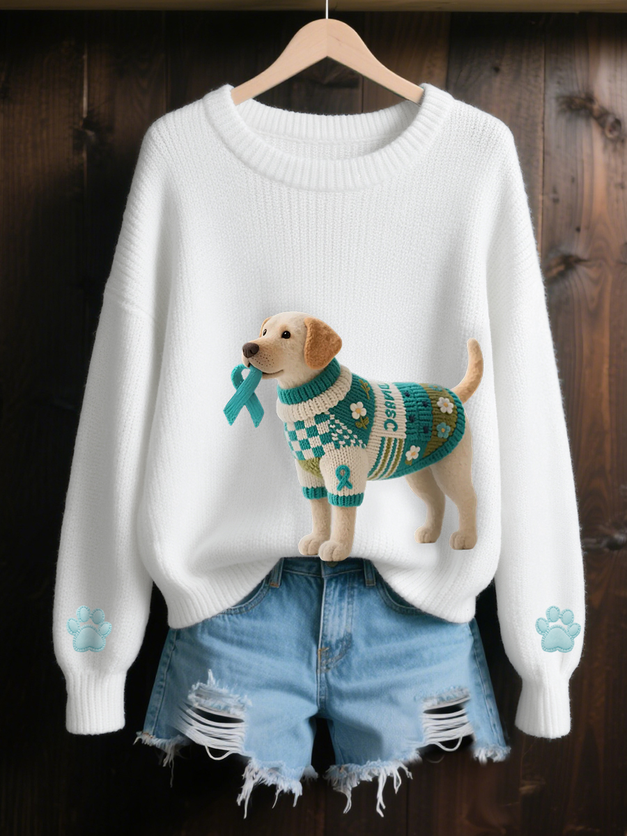 Women's Teal Ribbon Teal Dog Print Ovarian Cancer Awareness Sweater